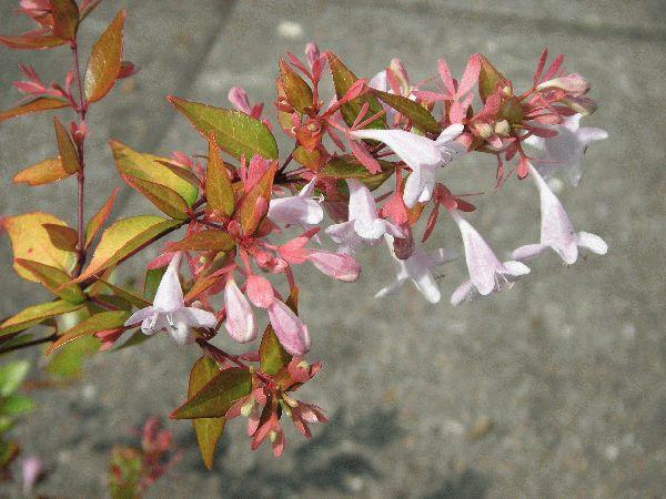 Мелкие продолговатые листья, заостренные кверху, в молодом возрасте слегка окрашены не только в розоватый, но и в золотистый оттенок. Крупные пятилепестные цветки, сросшиеся в белые кистевидные соцветия, имеют приятный аромат. Кустарник цветет несколько месяцев – с июня до октября. Эта разновидность Абелии крупноцветковой признана самым распространенным видом из семейства.