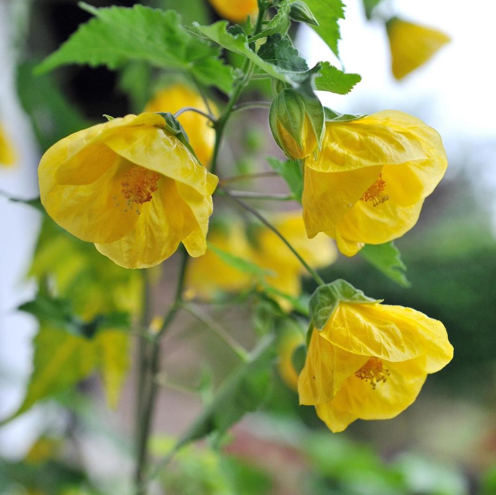Abutilon Juliya Gelb - кустарник от 20 до 60 см в высоту. Ствол мощный. Листья глянцевые, резные. Цветки - широкие, раскрытые колокольчики с лепестками ярко-желтого цвета, глянцевые и гладкие. Пестики белоголовые, находятся на длинных ножках. Цветение обильное.