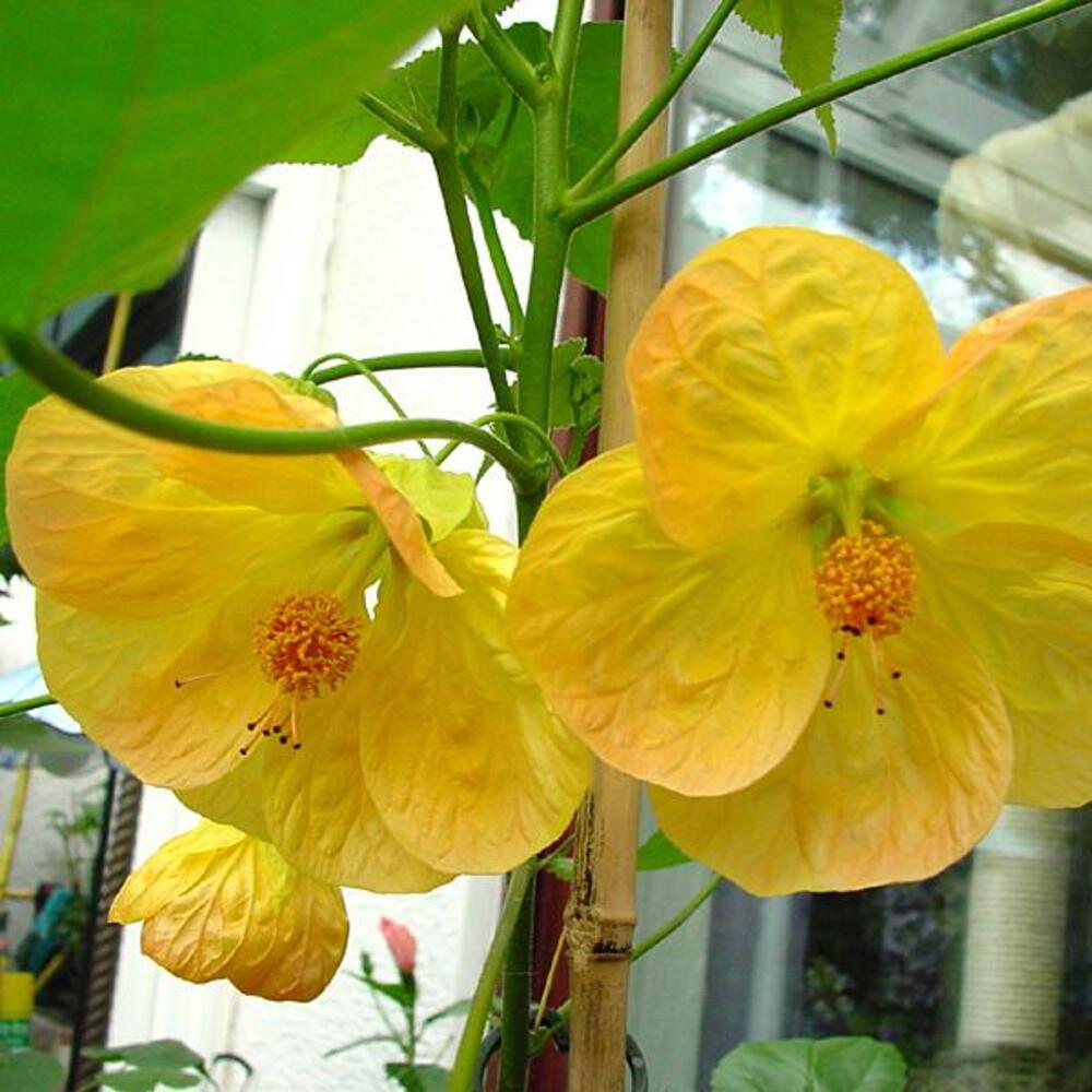 Abutilon Sonnentanz - крупный кустарник размером от 50 до 110 см. Листья тройчато-лопастные, удлиненные, зеленые, средних размеров (5-7 см в длину). Форма цветка - колокольчик. Лепестки с внутренней стороны глянцевые, ярко-желтые, с внешней и на кончиках - с легкой тенью лососево-розового. Цветение обильное.