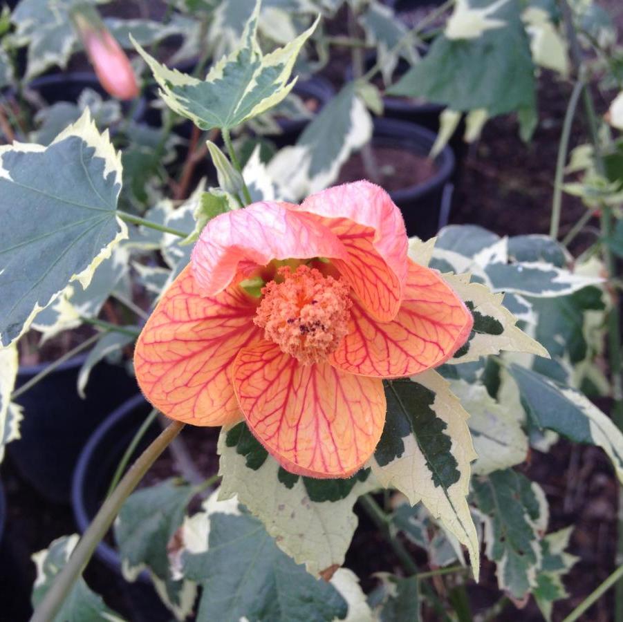 Abutilon Souvenir de Bonn - среднерослый декоративный кустарник от 50 до 100 см в высоту. Листья глянцевые, темно-зеленые, со светлой каймой по периметру. Цветки крупные, размером 7-10 см в диаметре. Лепестки оранжевые с темным жилкованием. Цветение умеренное.