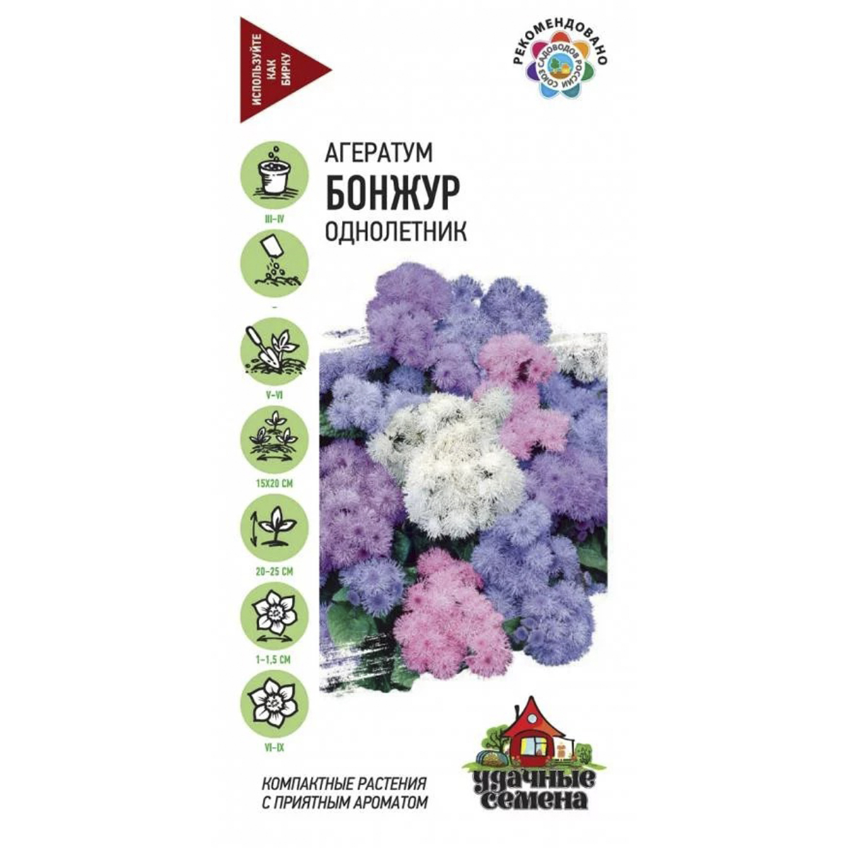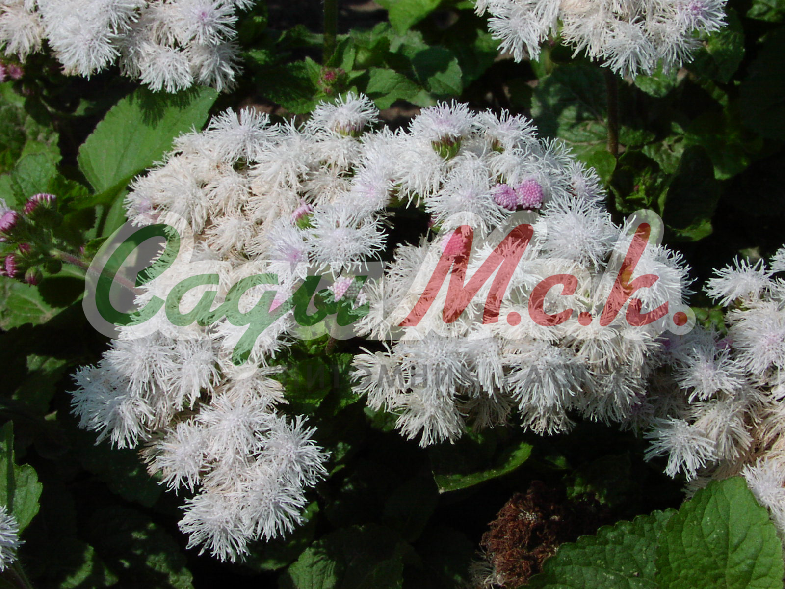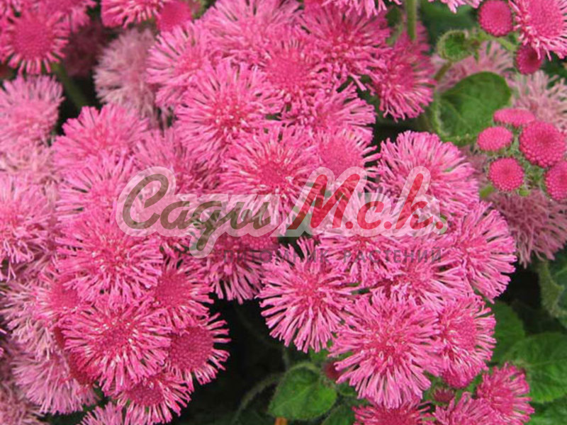 Очень красивая и длительно цветущая смесь сортов с большими пушистыми шапками соцветий. Растения из семейства Астровые, высотой 20-25 см. Цветение обильное с июня до заморозков. Соцветия мелкие, душистые, до 1-1,5 см, собраны в более крупные щитковидные соцветия до 8-10 см в поперечнике. Окраска разнообразная. Агератум засухоустойчив, светолюбив, но может расти при небольшом затенении, предпочитает легкие, умеренно плодородные почвы. Теплолюбив, заморозков не переносит. Используют на клумбах, в рабатках, миксбордерах, агератумами украшают балконы.