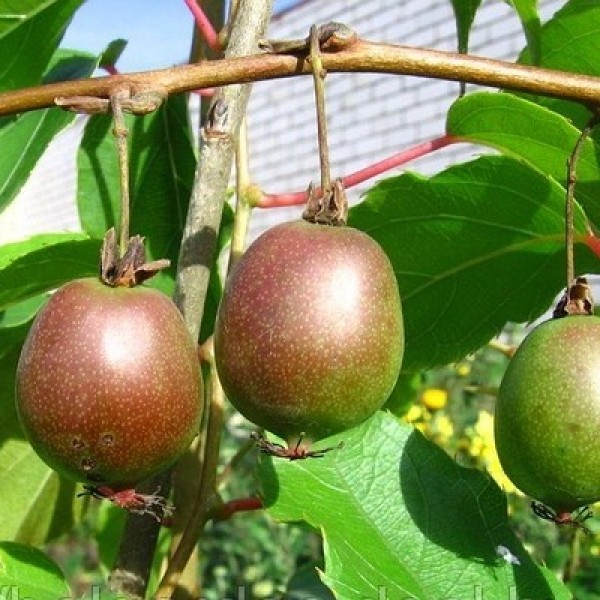 Актинидия аргута Вейки (женский) – для успешного плодоношения, которое наступает на 3-4 год, нуждается в опылителе, т.к. это двудомный cорт. Плоды зеленого цвета, при созревании появляется легкий румянец. Размер плода около 3 cм. У этого сорта очень декоративная листва: на красных корешках тёмно-зелёные, слегка глянцевые листья. Достаточно морозостойкий и устойчивый к заболеваниям сорт. Плоды употребляют в пищу сырыми, используют для приготовления джемов, желе, мармелада. Также их можно замораживать и сушить.