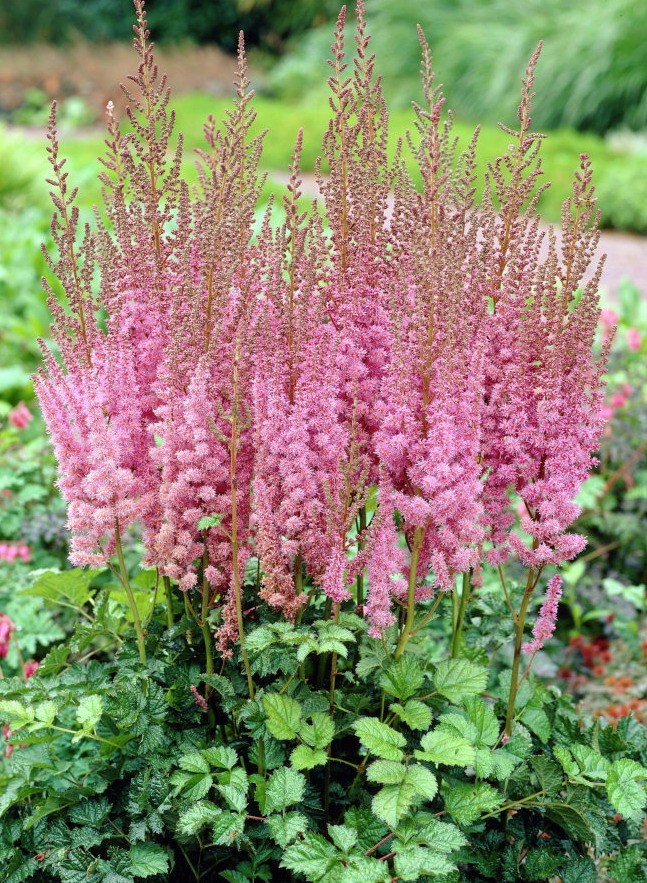 Саженцы астильбы Suреrbа – это высокорослые сильные кусты, которые в период цветения вызывают восхищенные взгляды насыщенными красками своих пурпурно-фиолетовых соцветий. Темна-зеленая листва этого сорта имеет бронзовый оттенок, благодаря чему растение является декоративным на протяжении всего сезона. В июле-августе появляются большие пышные соцветия с легким ароматом.