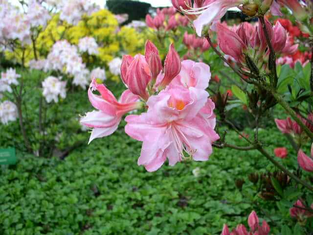 Азалия Raimunde - строго вертикальный или распростертый кустарник, у старых растений ассиметричная воронковидная крона, скорость роста средняя. Высота и ширина растения - 1,5-2 м. Листья при распускании бронзовые, затем темно-зеленые, осенью изначально малиново-красные, затем оранжево-желтые. Цветки светло-розовые с темно-розовыми штрихами, крупные, в форме колокольчика или чаши.