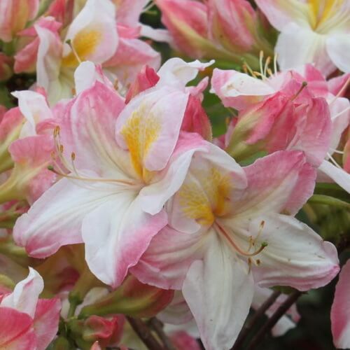 Азалия Satomi - кустарник с рыхлой прямой кроной, растет быстро. Листья при распускании бронзовые, затем темно- зеленые. Цветки розовые или бело-розовые с желтыми пятнами колокольчатые, ароматные. Цветет до распускания листвы. Высота взрослого растения - 150-200 см.
