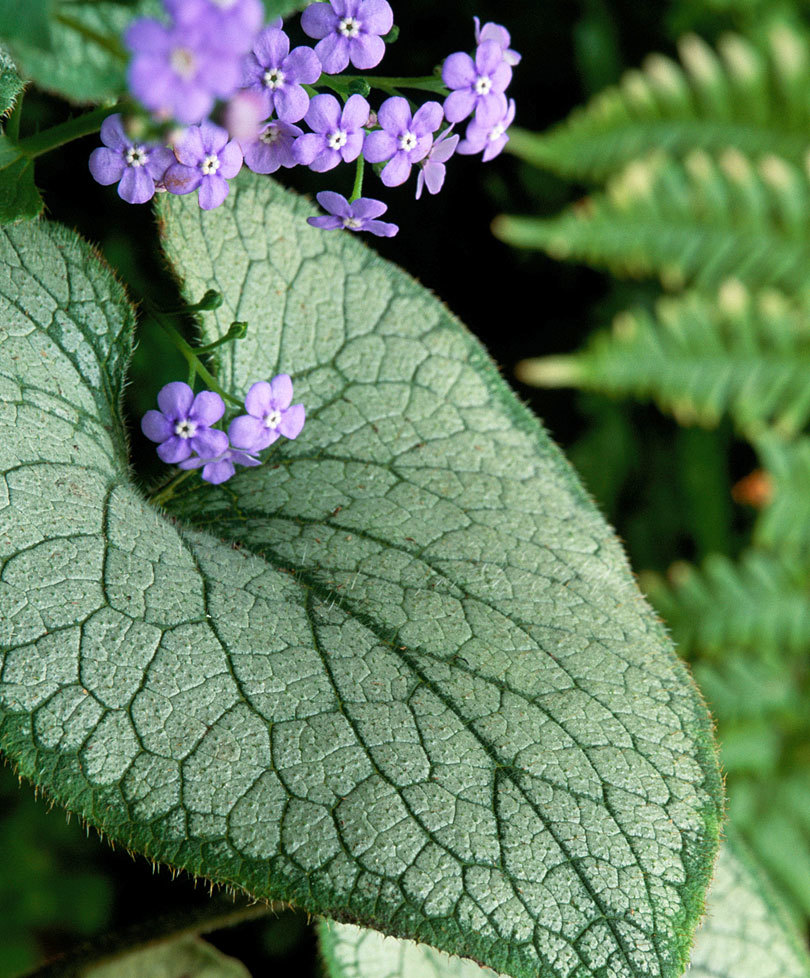 Бруннера крупнолистная сорта Jack Frost – многолетнее цветущее растение. Этот сорт характеризуется крупными листьями серебристо-морозного цвета с узкой темно-зеленой каймой и такого же цвета явно заметными прожилками.Цветы этого невысокого травянистого кустарника (40-60 см в высоту) приятного лилового цвета с белой сердцевиной.Хорошо цветет не только на солнечных участках, но и в затененных уголках сада или парка. Прекрасно переносит зимние холода, сильных морозов не боится. На одном месте без пересадки может прекрасно цвести и развиваться в течение 15 лет.В народе называется незабудочником, поскольку его цветы по форме очень напоминают незабудки. Однако, в отличие от них, цветы бруннеры значительно крупнее и не источают аромата.Любит достаточно увлажненную почву.