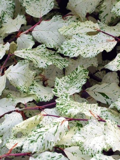 Бук лесной Франкен на штамбе – молодые листья с многочисленными белыми крапиночками, почти белые