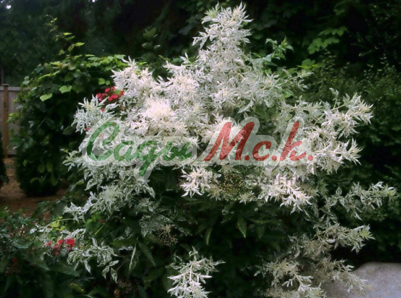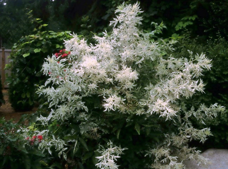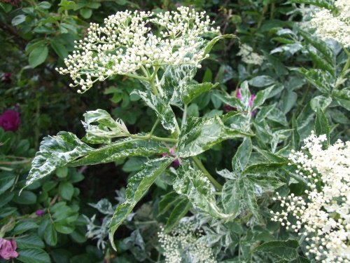 Бузина черная Пулверулента – один из красивых декоративных сортов растения, который часто используют для озеленения участков. Причем ценится он не столько за пышное цветение, сколько за оригинальные листья пестрой раскраски. Вполне «удобных» размеров куст формирует пышную пестролистную крону и будет выделяться ярким пятном в саду.