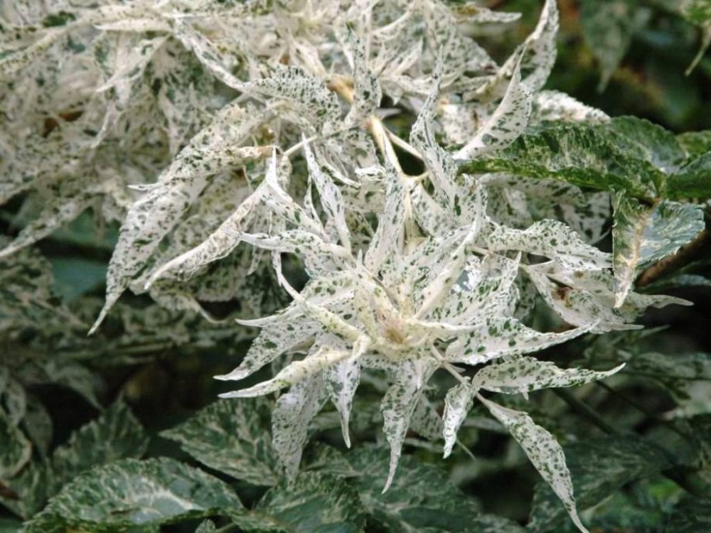 Вырастает бузина максимум до 2 м в высоту, но при этом формирует пышную раскидистую крону. Хотя растет куст медленно, диаметр кроны может достигать 1,5 м. Побеги раскидистые, покрытые светло-серой корой. Главное достоинство сорта – эффектная раскраска листьев. Они крупные, перисто-рассеченные. Основной фон представлен в темно-зеленом цвете, а по всей листовой пластине рассыпаны белые пятна. Они могут иметь разную форму и величину, вместе же составляют причудливый рисунок. Порой такой узор покрывает почти весь лист, оставляя лишь небольшие зеленые полоски.