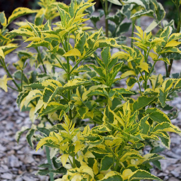 Один из лучших пестролистных кустарников. Пряморастущий, многоствольный, высотой до 300 см и шириной 240 см. Растёт медленнее, чем другие сорта. Листья зелёные с жёлтой каймой, состоят из 5-7 листочков с острыми зубчиками по краям, распускаются ранней весной. Цветёт в июне-июле в течение месяца. Цветки кремово-белые, в зонтиковидных соцветиях. Плоды мелкие, шаровидные, чёрно-фиолетовые, блестящие. Место солнечное. Почва слегка увлажнённая, рыхлая, питательная. Зона 5 (до -23ºС).