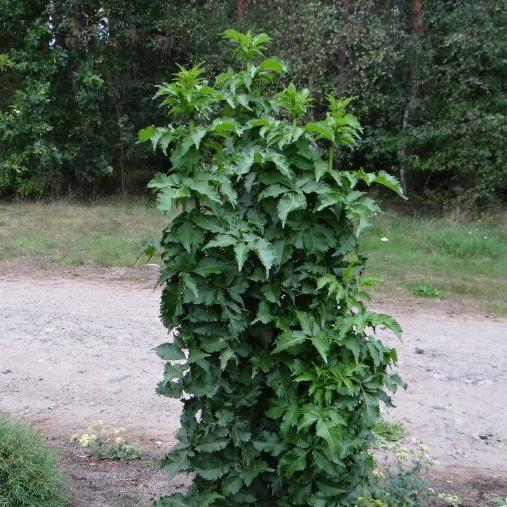 Прямостоячий кустарник столбчатого типа, медленно растущий. За 10 лет вырастает до 2 м, максимальная высота до 3-4 м. Побеги толстые, светло-серые, слабо разветвленные, привезенные, густо лиственные. Старая кора серая, глубоко бороздчатая и пробковая. Листья редуцированные, тускло-зеленые, сложные, на коротких черешках, до 15 см длинные, состоят из 3-7 яйцевидных листочков, до 5 см длинные, заостренные, по краю нерегулярно зубчатые. Листья рано появляются весной, долго держатся на кусте осенью. При растирании они дают характерный резкий запах. Цветки мелкие, кремово-белые, собраны в дисковидные навесы диаметром 10-20 см, душистые, охотно посещаемые бабочками. Цветет в конце мая-начале июня. Плоды мелкие, ягоды шаровидные, спелые-блестящие, темно-черные, очень сочные. Созревают с августа по октябрь. Плоды охотно поедаются птицами, способствующими их распространению. Кустарник нетребовательный, устойчив к засухе и городскому и промышленному загрязнению. Полностью морозостойкий. Предпочитает плодородные, гумусные и влажные почвы с высоким содержанием азота и кальция, но растет также на песчаных и сухих, хотя и несколько слабее. Требуется солнечное или слегка затененное место. Куст для посадки в приусадебных участках, как элемент, занимающий мало места. Подходит для создания неформальных живых изгородей.