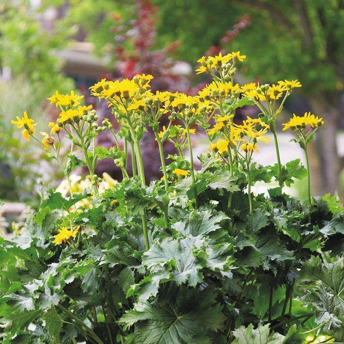 Бузульник пальчатолопастный эффектно смотрится в июле-августе, когда над пышной зеленью распускаются желтые цветы, собранные в рыхлые соцветия. Растение вырастают до 180 см. Яркий многолетник используется для формирования заднего фона клумб и смешанных посадок. Бузульник пальчатолопастный отлично смотрится у водоемов и подходит для декорирования садовых ограждений.