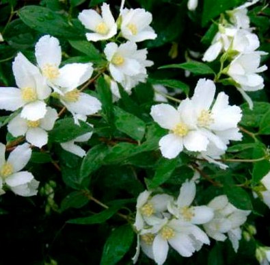 Чубушник Erectus - куст высотой 1,5 - 2 м. Листья длиной 2 - 3 см, летом темно-зеленые, осенью - желтые. Цветет в июне. Цветки, диаметром до 3 см, простые, белые, с сильным запахом.