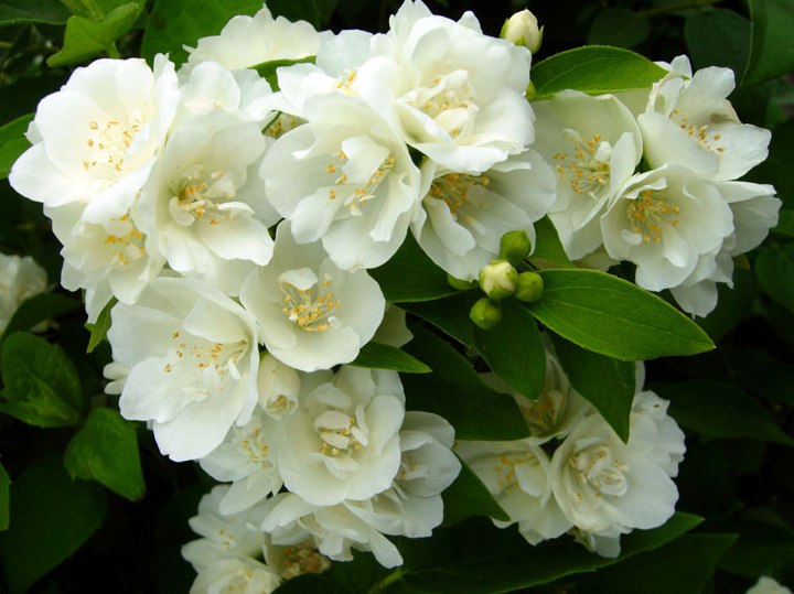 Чубушник Pompon - куст высотой около 1,5 м, с прямостоячими побегами. Цветет обильно, в течении 20-25 дней. Цветки снежно-белые, мелкие, махровые, душистые, собраны в соцветия по 5-7 шт.