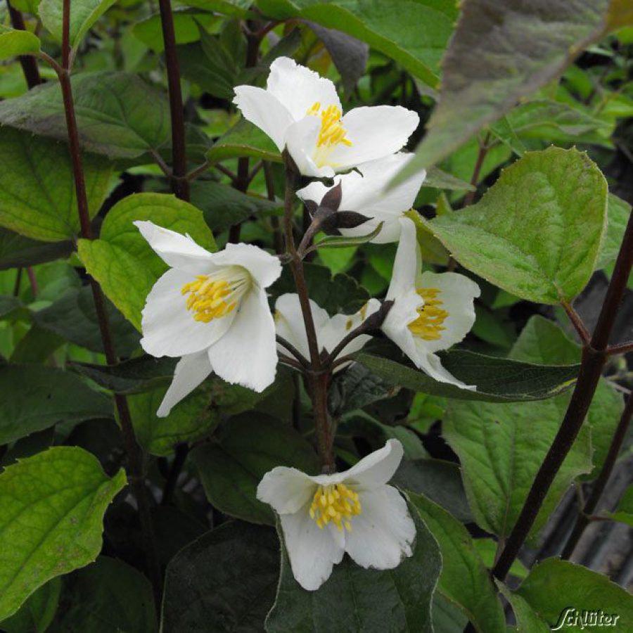 Саженцы чубушника Starbright являются, действительно звёздными лидерами в этой разновидности кустарников. В момент цветения душистые цветы покрывают всю поверхность куста. Белые махровые соцветия размером 4-5 см напоминают снежные шапки. Цветение проходит в самый пик летнего сезона июнь, июль. Плоды, образующиеся после цветения, практически незаметны и не требуют срезки. Куст вытягивается на тенистых участках до 3 м в высоту. Растение раскидистое и пышное, поэтому рекомендуется сажать крупномер Starbright на свободных территориях, чтобы исключить зажатость цветов и веток. После зимы этот сорт нуждается в косметической обрезке. Устойчивость к холодам очень хорошая.