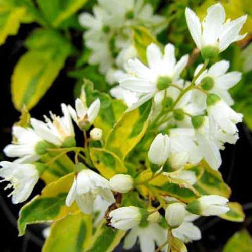 Изящный пестролистный кустик с тонкими дуговидными ветвями высотой до 1 метра. Листья продолговато-ланцетные, заостренные, опушенные с верхней стороны, осенью – золотисто-желтые. Цветет с мая по июнь на побегах прошлого года