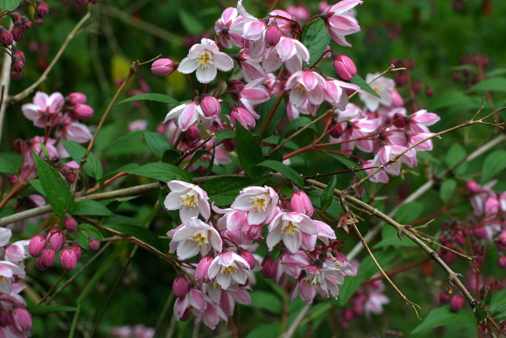 Прекрасный кустарник для солнечных или участков с ажурной полутенью. Высота куста до 1,5 м, тонкие ветви и коричневые слабо опушённые однолетние побеги. Соцветия слабоопушённые, рыхлые полузонтики из 5-12 цветков нежного розового цвета. Своими темно-розовыми бутонами дейция пурпурная украсит ваш участок в конце весны-начале лета. У Дейции элегантные дугообразные ветви, с конца весны до начала лета Deutzia х kalmiiflora просто утопает в цветах, которые привлекают пчел. Листья у нее яйцевидные или широколанцетные (5 см длиной и 2,5 см шириной), остроконечные, мелкопильчатые по краю. Сверху листья ярко-зелёные, снизу бледно-зелёные, с обеих сторон редкое опушение. Цветы(до 2 см) в середине бело-розовые, снаружи ярко-розовые, собраны в вертикальные соцветия (15-20шт). Период цветения май-июнь. Зимостойка, не требовательна, легко адаптируется, однако лучше высаживать в защищенном от ветра месте, и в первые годы обязательно укрывать на зиму. Рекомендуем для южных районов нашей страны, максимальный минус, который она может кратковременно перенести: -28 C максимум при снеге
