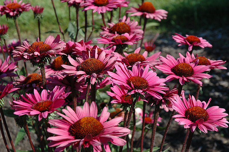 Эхинацея пурпурная Фатал Этрекшн: Цветки диаметром 8 см, необычайно красивые, крупные, фиолетово-розовые, ароматные. Лепестки несвисающие. Цветение обильное. Стебли крепкие тёмно-красные.