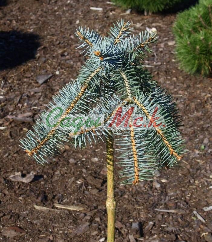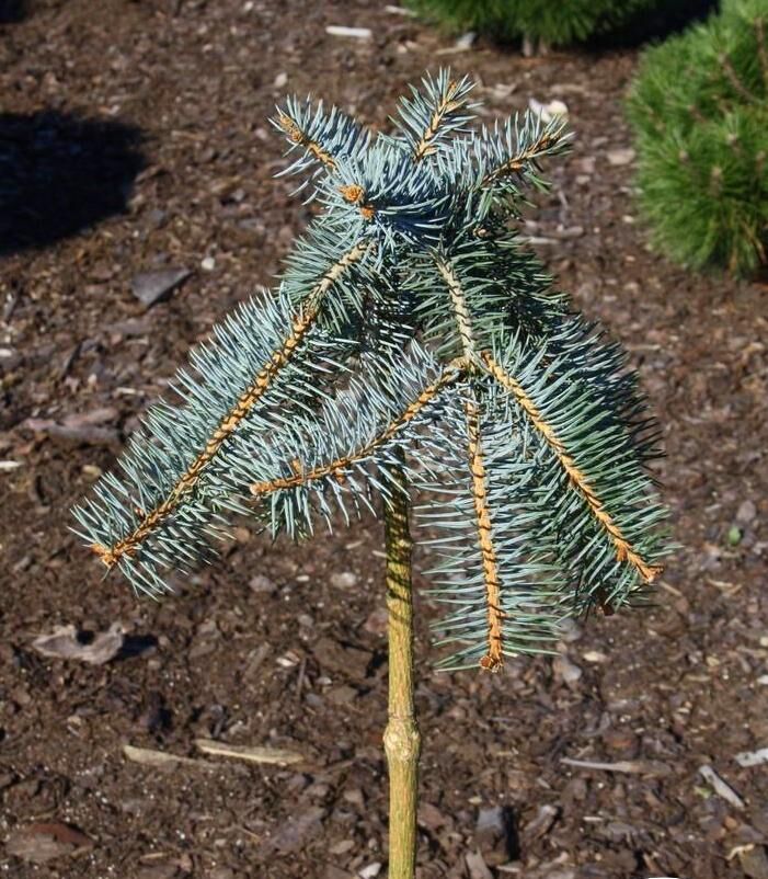 Ель колючая Глаука Пендула - отличается необычной формой кроны с плакучими ветвями и голубой хвоей. Растет довольно быстро до 30 см в год. Высота дерева зависит от высоты, на которую произведена прививка и формирования ведущего побега. Высота взрослого растения может быть до 8-10 м. Ветви довольно жесткие, образуют эффект каскада, густо покрывают ствол. Нижние ветви низко расположены, практически лежат на земле, плакучие. Хвоя жесткая, плотная, голубовато-зеленая, 1,5-2,0 см, расположена радиально. Красивая голубая окраска хвои сохраняется в течение всего года при посадке на солнечном месте.