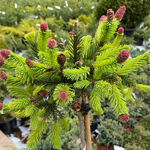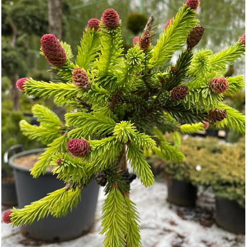 Миниатюрная форма сорта ели Акрокона. Крона нерегулярная, плотная, округлая, со свисающими побегами. Растет медленно. В 10 лет высота не превышает 0,3 м и 0,6 м в диаметре. Главным достоинством ели обыкновенной "Пуш" являются многочисленные шишки небольшого размера. При распускании они бывают от нежно-розоватого до насыщенного красно-фиолетового цвета. Шишки мелкие, образуются на побегах текущего и прошлого года. Хвоя короткая, зеленая. Такое оригинально растение отлично подойдет для посадки в альпинариях, рокариях, низкорослых хвойных группах, послужит хорошим дополнением вересковых садов
