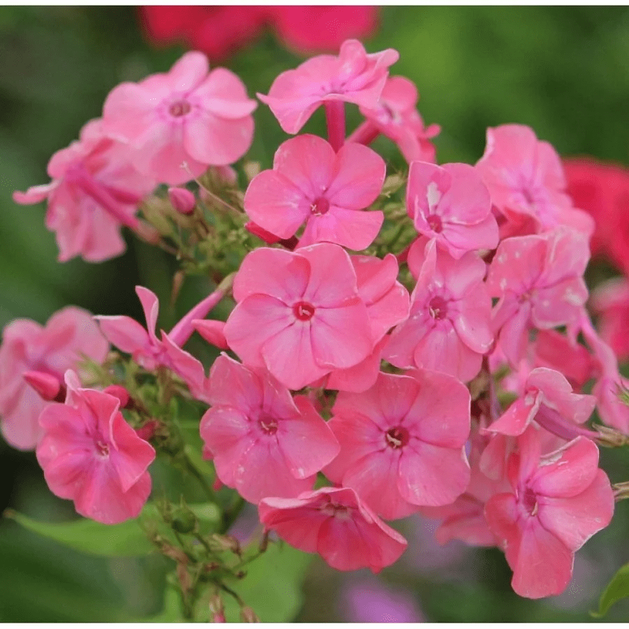 Флокс метельчатый Клементина имеет розово-лососевый оттенок с эффектным белым центром и пурпурным колечком. Лепестки плотно соприкасаются друг с другом или немного налегают. Срок цветения ранний. Соцветия овально-конической формы.