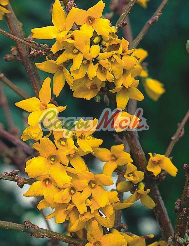 Широкораспростёртый декоративный кустарник высотой и шириной 200-250 см. Листья длиной 5-7 см, тёмно-зелёные, зазубренные по краю. Цветки золотисто-жёлтые, очень крупные, длиной до 4 см, колокольчатые со сросшимися у основания широкими лепестками, слегка душистые. Цветение в апреле в течение 2-3 недель, до распускания листьев, очень обильное, по всей длине побегов. Место солнечное. Почва умеренно влажная, лёгкая. Зона 5 (до -23ºС). В суровые зимы наблюдается подмерзание цветковых почек. Подходит для живых изгородей. Очень хорошо переносит обрезку