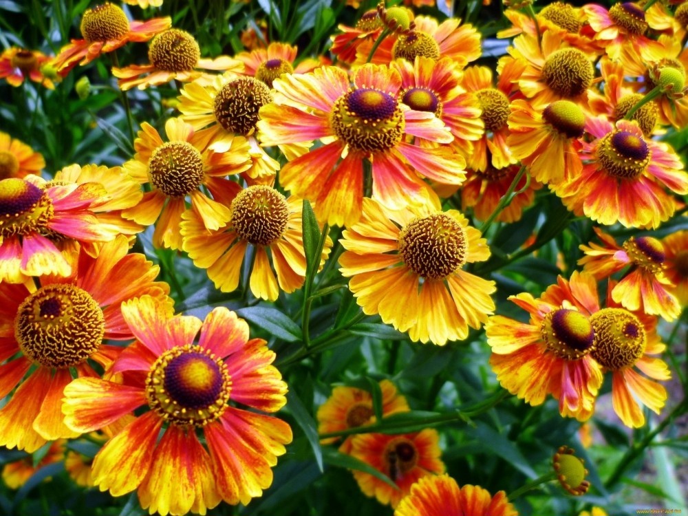 Гелениум Кармен. Компактный гелениум высотой 40-50 см. Побеги начинают ветвится прямо от земли. Цветки жёлтые с оранжевыми оттенками и тёмно-коричневым центром. Цветение обильное. Хорошо подходит для срезки.
