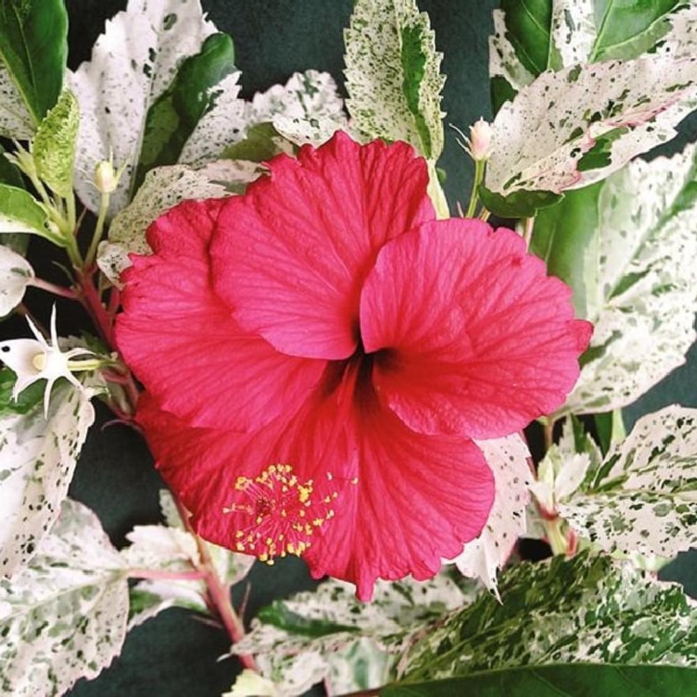 Красивейший пестролистный гибискус. Цветы простые, огненно-красные, с зубчатым краем лепестков и длинным пестиком. Трехцветные листья как мозаика из двух разных оттенков зеленого цвета и крупных белых фрагментов, которые летом розовеют на ярком солнце. В зимнее время молодые листья могут слегка позеленеть, зато такие черенки легко укореняются. В полной красе пестролистность проявляется на хорошо освещенном, солнечном месте.