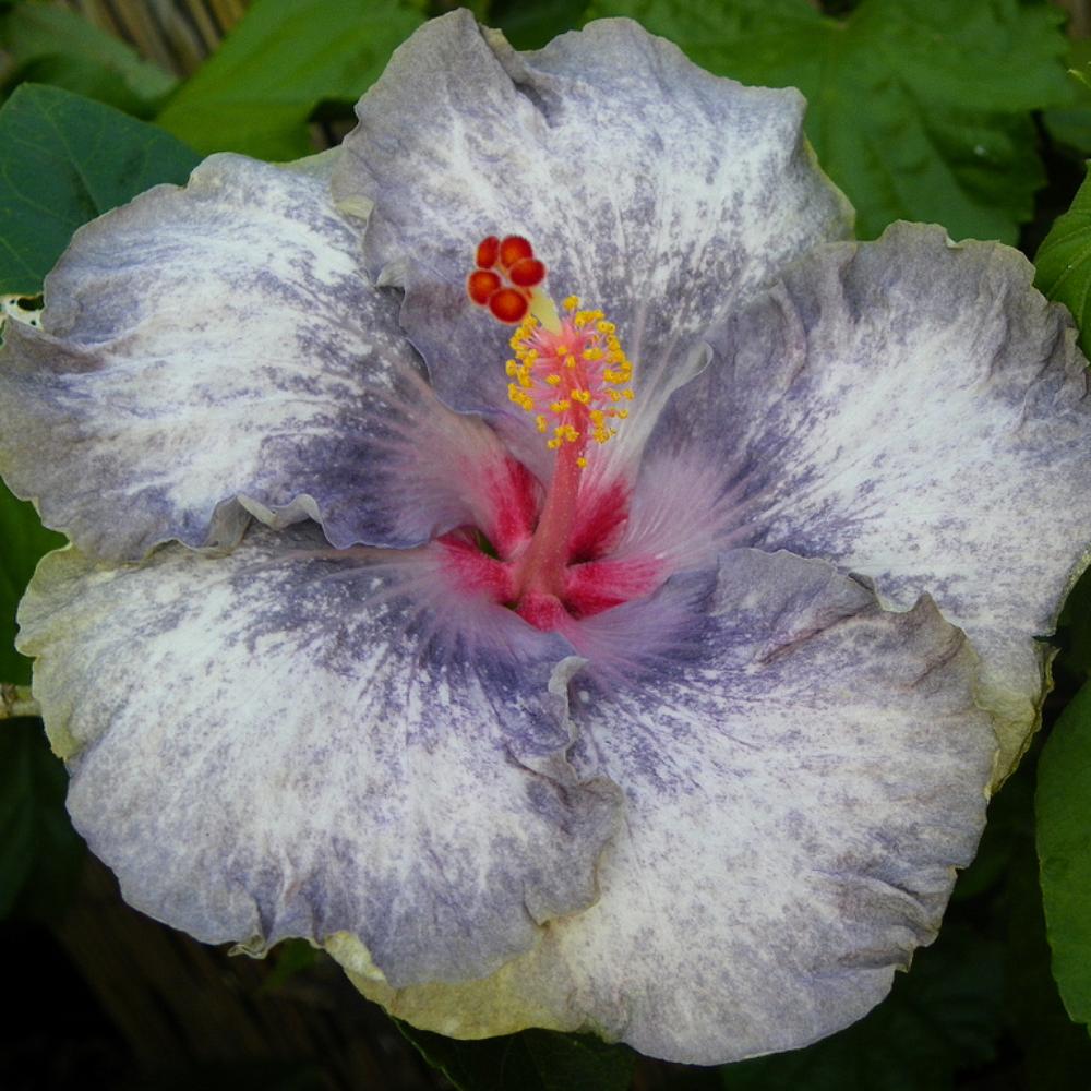 Гибискус White Diamond - декоративный кустарник, реагирует на температуру. Цветки простые, серовато-лиловые. На лепестка есть большое количество белых штрихов и пятен.