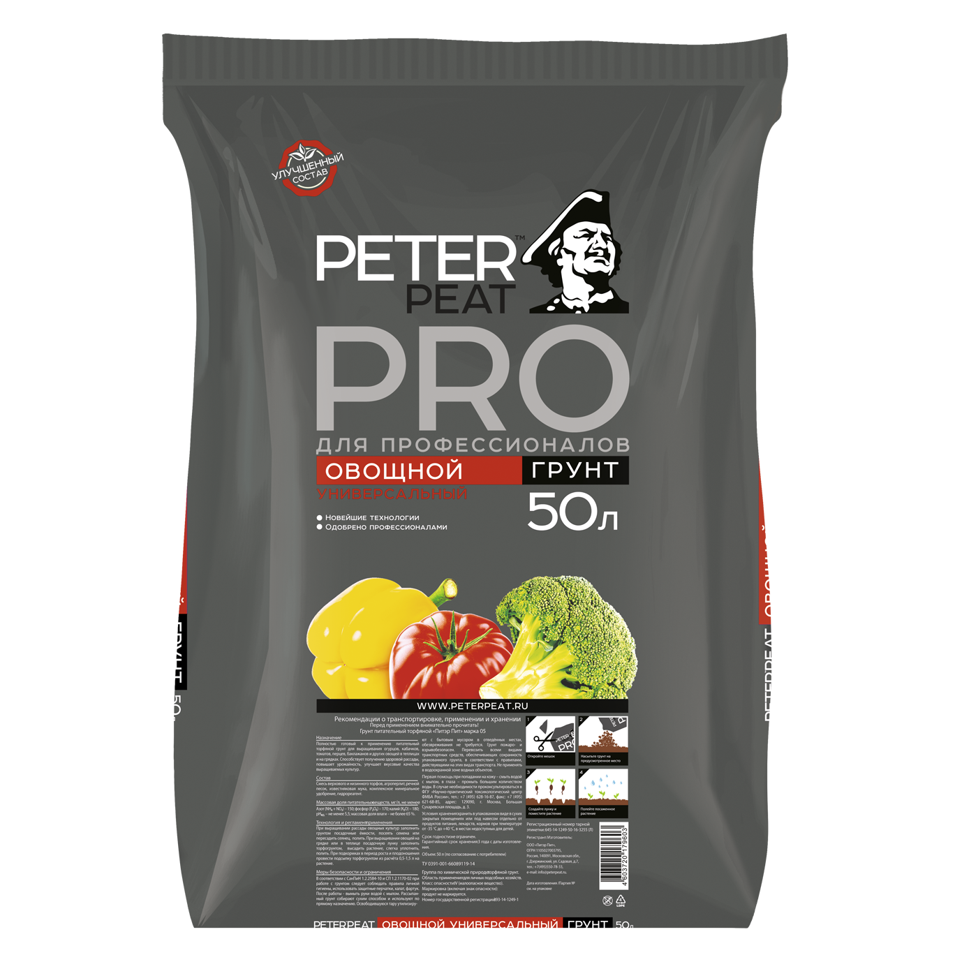 Грунт Овощной Универсальный (Линия ПРО) 50 л - питательный грунт. Для выращивания огурцов, кабачков, томатов, перцев, баклажанов и других овощей в теплицах и на грядках. Способствует получению качественной рассады, повышает уражайность, улучшает вкусовые качества выращиваемых культур.