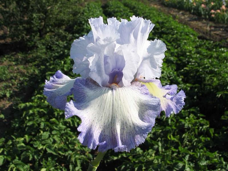 Рассада ириса Acoma относится к высоким бородатым ирисам, известным как пликата, т.е. в которых яркий рисунок располагается на более светлом фоне. Это однократно цветущий ирис, на каждом стебле которого развивается от 5 до 6 бутонов. Нижние доли (фолы) имеют светлый фон цвета слоновой кости и фиолетовые края, мягко переходящие друг в друга. Верхние доли (стандарты) – светло-светло-голубые, вертикально подняты вверх. Бородка – желтая, малозаметная. Верхние и нижние доли слегка гофрированные. Цветение среднее.
