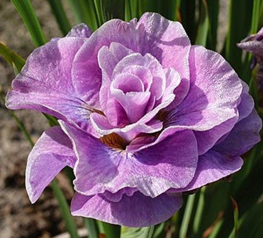 неприхотливость в уходе. Бутон ириса сибирского Розовое Парфе действительно по форме напоминает многолепестковую розу. Оттенок у цветка розово-лавандовый с желтыми пятнами у оснований бархатных лепестков. Цветение этого сорта ириса наполняет воздух в саду приятным благоуханием.