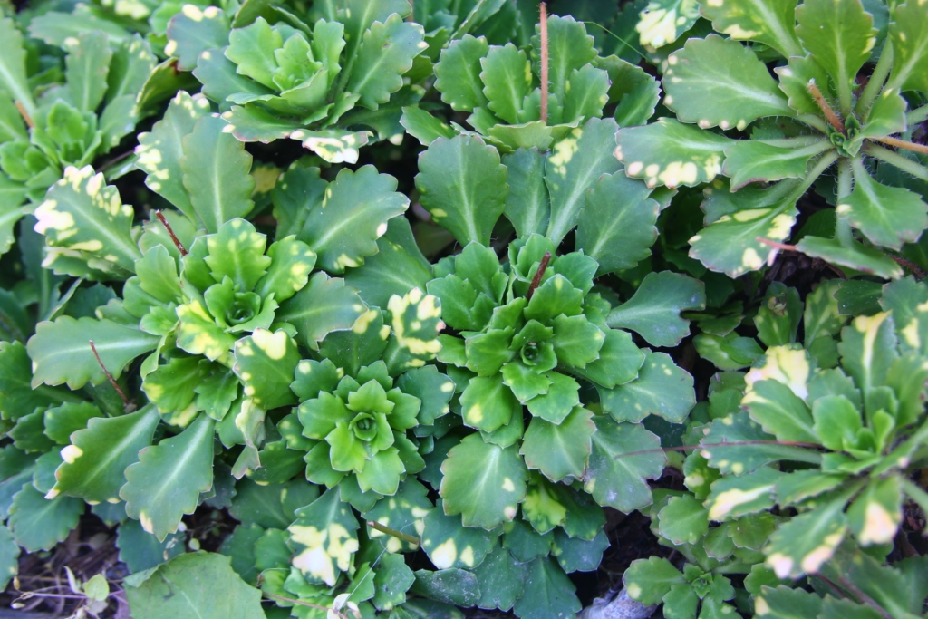 Камнеломка теневая: образует густой ковер 15 - 30 см высотой. Лист широкий, лопатовидный, зеленый, вечнозеленый. Соцветия белые, в середине розовые, звездовидные, в метелках. Вариегата: розетка до 8 см в диаметре, листья с желтыми полосами, цветоносы до 30 см с белыми цветами.