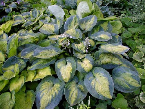 Хоста Suреr Nоvа – очень оригинальный и контрастный сорт, широко используемый в ландшафтном дизайне. Ее широкие, круглые, слегка морщинистые листья образуют аккуратный, компактный кустик очень красивой формы, который выглядит ярким и нарядным букетом. Центр листовой пластины золотистый, перистый, а вот по краям проходит сизо-голубая широкая кайма, неровная, с мазками и пятнами. Зацветает растение в июле, и его нежными белыми цветками можно любоваться довольно долго. Красивее и контрастнее выглядит многолетник в тени, хотя хорошо себя чувствовать может и на солнце. Нарастает медленно и сохраняет свою окраску в течение всего сезона. Сорт неприхотлив, не поражается болезнями и вредителями.