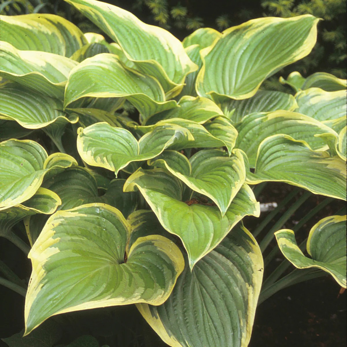 - Характеристики гигантская хоста, крупные белестящие сердцевидные зеленые листья с кремово-желтым краем, позже кант становится почти белым, цветки почти белые