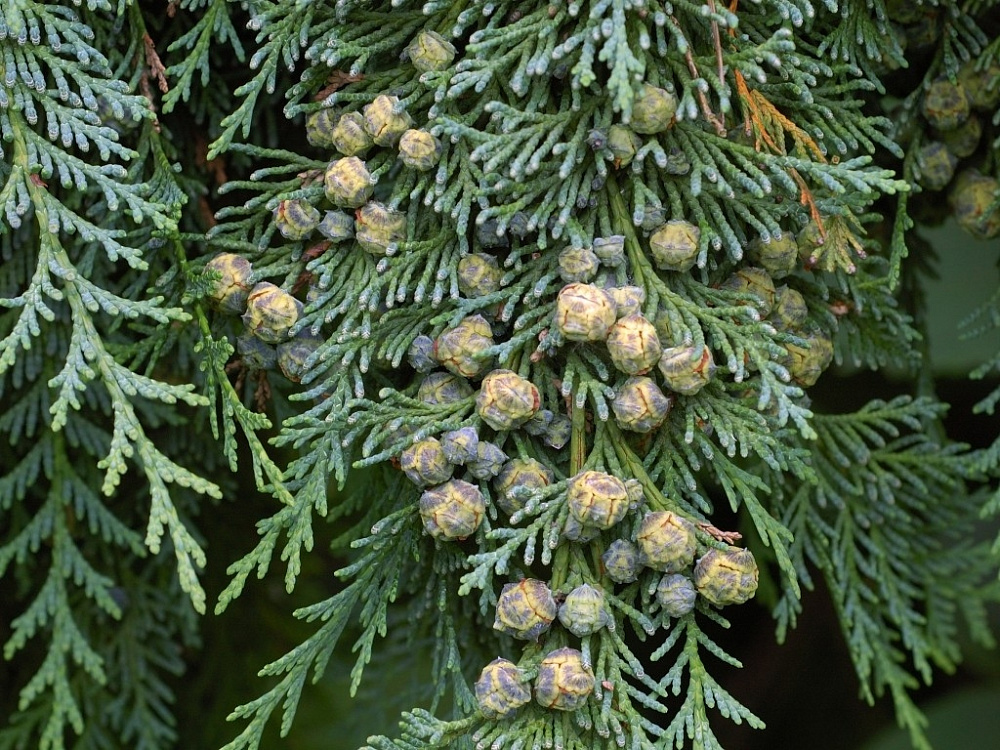 Хвоя чешуйчатая, зеленая, густая, плотно прилегает к ветвям. Молодая поросль мраморно-белая или белая, к зиме зеленеет