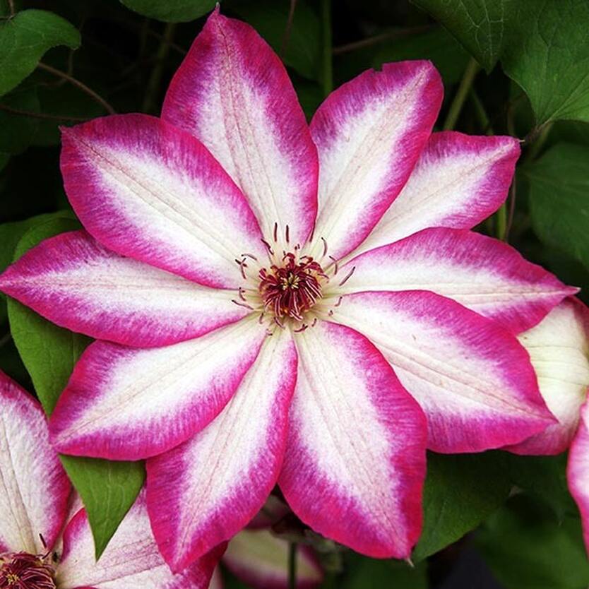 Клематис Пикоти (Clematis Picotee) издалека напоминает фейерверк. Лиана затягивает предложенные ей опоры. Во время цветения один за другим открывает цветы, похожие на звёзды. Раскрас их необычен. Середина лепестка белая или молочная, а края ярко очерчены тёмной, пурпурно-красной каймой. В центре цветка коронка из бордовых тычинок. В итоге всё лето лиана усыпана большими – до 15 сантиметров в диаметре – цветами-звёздами. Уход за клематисами не требует особых умений. Посадить в удобренную землю на солнечное или слегка притенённое место, поливать, рыхлить. На зиму Клематис Пикоти обязательно снять с опоры и тщательно укрыть.