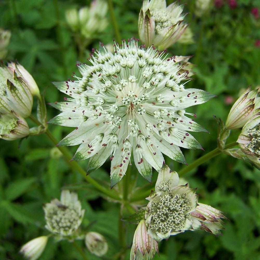 Астранция крупная Шегги (Astrantia major Shaggy) — отличное решение для озеленения сада или клумбы, парка или зоны отдыха. Это высокое растение — в период активного роста оно может достигать 75 см. На его побегах в течение лета появляются нежно-белые соцветия с зеленоватым оттенком. Цветение продолжается до начала сентября. Астранция Шегги — многолетнее растение, хорошо приживается на любом участке и быстро растет как на открытом солнце, так и в тени. Кусты вырастают пышными и раскидистыми, требуют минимального ухода: достаточно поддерживать постоянную влажность почвы. На зиму надземная часть у Астранции крупной Шегги отмирает, но лучше использовать ее для срезки и создания ярких оригинальных букетов. В композициях этот сорт разбавляет яркую цветовую гамму либо дополняет пастельные оттенки.