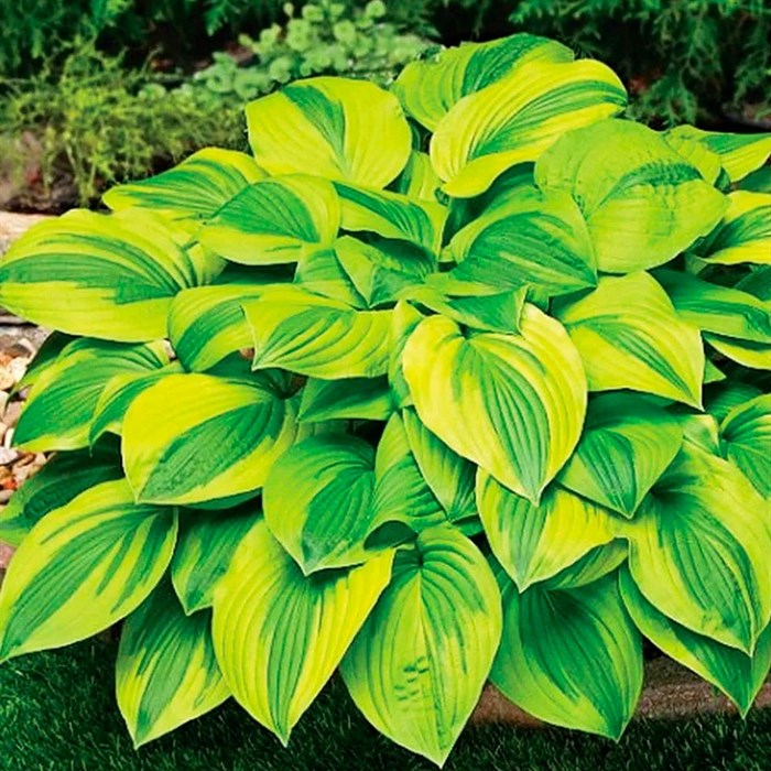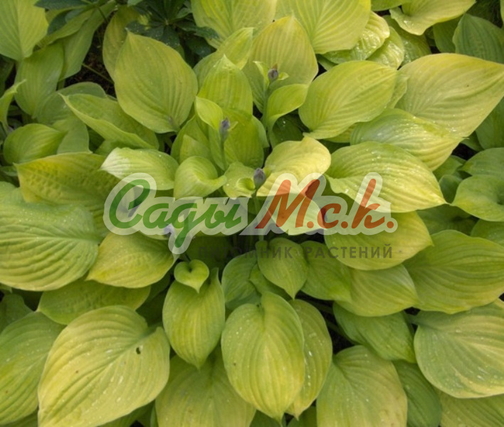- Характеристики яркая, эффектная хоста. Крупные темно-зеленые листья, я срко выраженным жилкованием и очень широкой золотистой каймой, цветки бледно-лавандовые