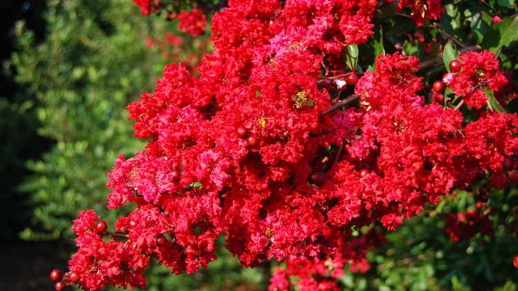Lagerstroemia Red Filli - среднерослый декоративный кустарник с темно-зелеными глянцевыми листьями. Цветки насыщенно-розовые, почти крансные, мелкие, с гофрированными лепестками, находятся в соцветиях - метелках. Сорт предпочитает солнце.