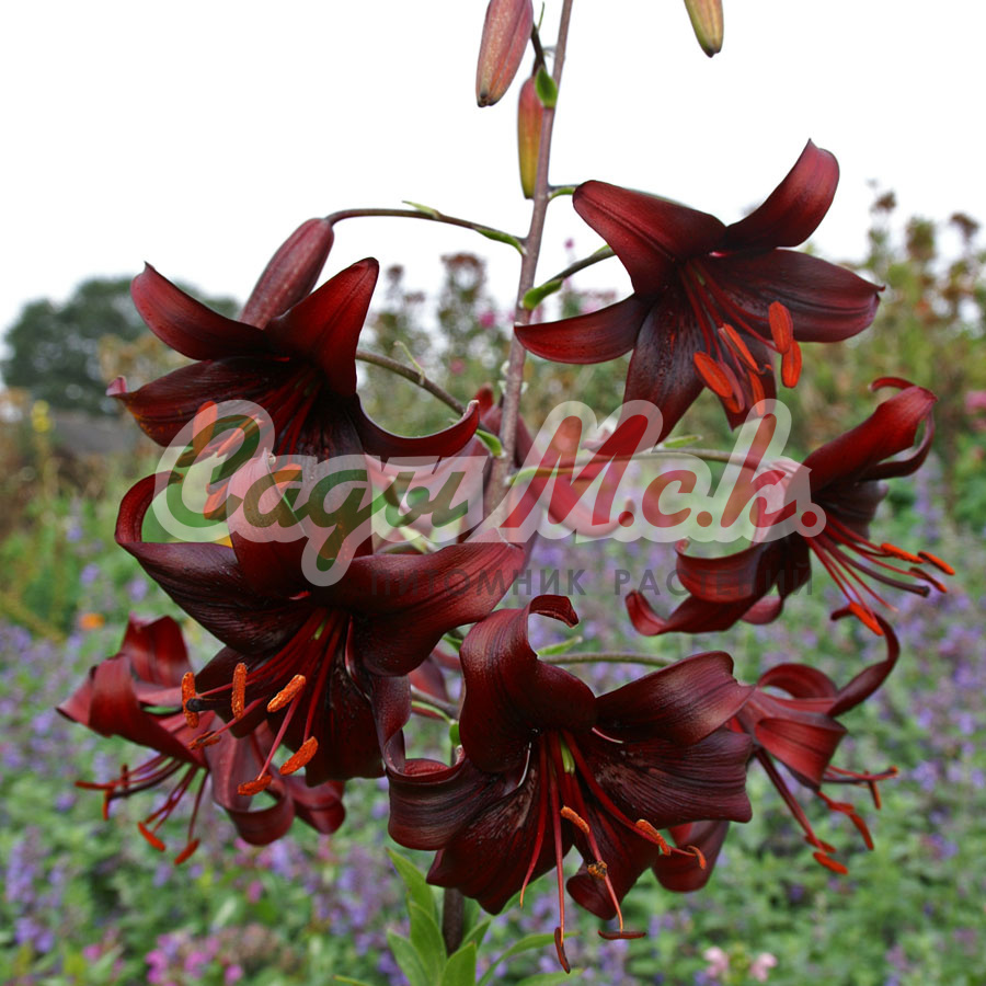 Луковицы Лилии азиатской Маскара (Lilium asiatic Mascara) ― удачное решение для клумб, на которых не хватает сочных, насыщенных темных оттенков. Цветки отличаются бордово-черным цветом с оттенками серого и фиолетового, переходящими друг в друга без четких границ, равномерно. Ближе к центру располагается россыпь черных крапинок. Эффект усиливается длинными красными тычинками с ярко-оранжевыми тяжелыми пыльниками. Именно они дарят лилии особую прелесть, придавая ей выразительность и яркость. Благородное величие Лилии азиатской Маскара полностью раскрывается на клумбе.