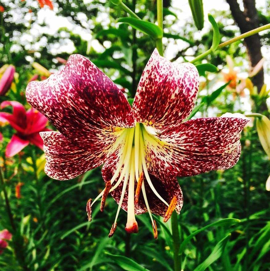 Лилия азиатская Пёпл Лайф - цветок белый с частым темно-фиолетовым напылением, центр салатово-желтый. Вырастает до 85 см. Цветёт во второй половине июня-июля. Аромат отсутствует. Зимостойкость у Лилит азиатской Пёпл Лайф хорошая.