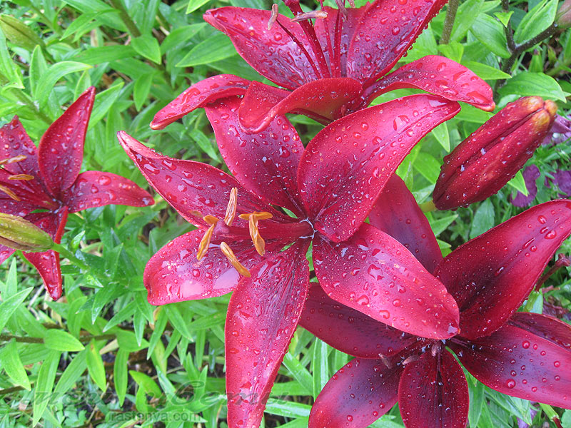 Лилия Black Out - самая неприхотливая лилия, доказавшая свою простоту в уходе и выращивании. Расцветает в июне-июле, образуя роскошный цветок карминно-красного оттенка с темно-вишневым отблеском в центре, и с легким крапом у основания лепестка. Диаметр цветка лилии этого сорта 17-18 см, на одном стебле распускается до 6-8 бутонов и цветут до 2-3 недель. Цветы почти не имеют запаха, но интригующий, насыщенный темно-красный, почти черный цвет с лихвой это компенсирует. В срезке стоит этот сорт до 2 недель, очень эффектно гармонируя в комбинированных букетах. Мощный стебель вырастает до 120-130 см, покрывают его листья очередные светло-зеленого оттенка.