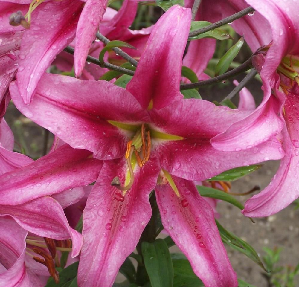 Цветки у Лилии ОТ-гибрида Пёпл Кинг крупные, сиренево-розовые с красноватой полоской по центру. Лилии немного опущены вниз. Период цветения приходится на вторую половину июля. Цветы располагаются на мощных темно-зеленых стеблях. Сорт Пепл Кинг может использоваться на срез, долго сохраняет свежесть в букетах.