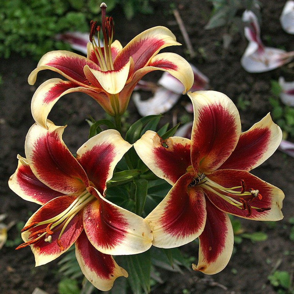 Лилия Red Dutch – красивейший двухцветный ОТ-гибрид. Каждый лепесток окрашен в винно-терракотовый цвет со светло-желтым обрамлением. Красный очаг расползается по желтому краю штрихами и точками, а уходя в зев значительно светлеет. Тычинки поднимаются из зеленого центра, имеют желтый цвет и коричневые пыльники. Кончики всех лепестков закручены наружу, а вместо крапа горло дополнительно украшено сосочками. Высота взрослого растения - 100-110 см.