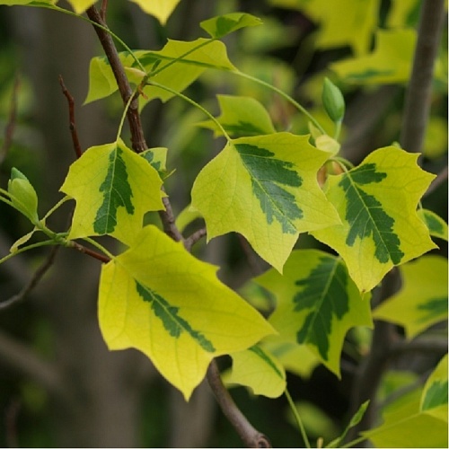 Лириодендрон Aureomarginatum - экзотическое, могучее, величественное, компактное, крупное дерево со стройным, ровным стволом и с широкой, пирамидальной кроной. Достигает 25-30 м высоты и 15-20 м ширины, листья 4-лопастные, лировидные. Цветение обильное и длительное, с мая по июль. Цветы необычные, по форме и размеру похожи на тюльпан, крупные, желто-зеленые, с оранжевыми пятнами в основании. Успешно выдерживают морозы до -25°С.