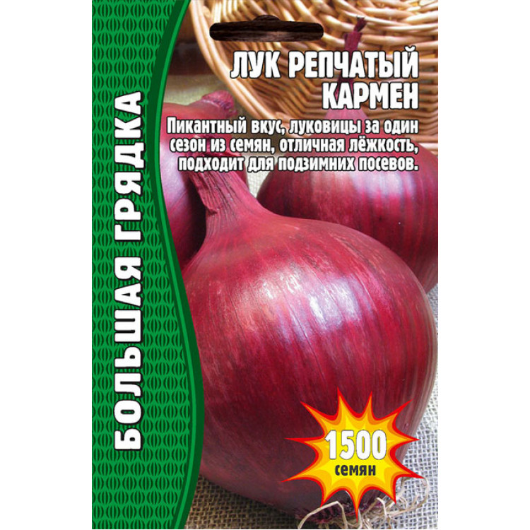 Вкус у Кармена - нежный, сладкий, мягкий и пикантный, а мякоть луковиц - сочная и хрустящая. Период от посева до массового полегания и пожелтения листьев 64-96 дней. Двух-трехзачатковый. Луковица округло-плоская, средней плотности, массой 70- 100 г. Окраска сухих чешуй красно-фиолетовая.