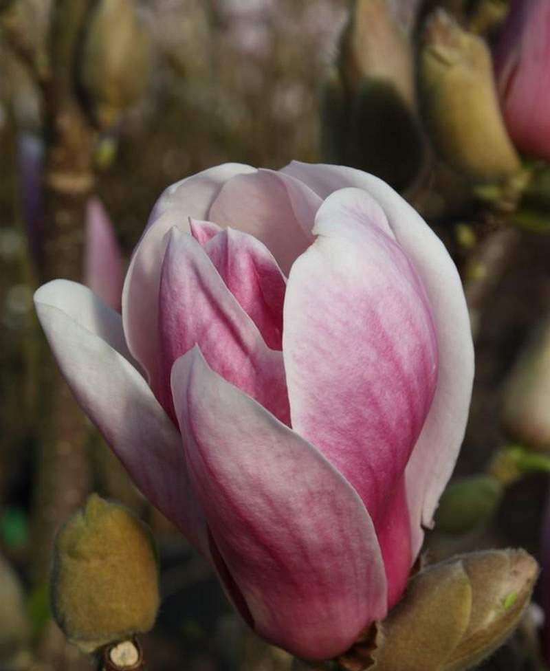 Магнолия Суланжа ‘Satisfaction’ — кустарник с медленным темпом роста, с закругленной формой. Листья темно-зеленые, снизу более светлые, опадают на зиму. Цветет обильно на переломе апреля и мая, до появления листьев или одновременно с их появлением. Цветы чашеобразные, багрово-розовые, душистые. Через 10 лет достигает около 2,5 м высоты и такой же ширины. Лучше всего растет на солнечном месте, защищенном от ветров. Магнолия для посадки предпочитает плодородную, влажную, гумусную и слегка кислую почву. Зимой нужно укрыть ее корневую ситему от промерзания. Благоприятно применять подстилку всего года