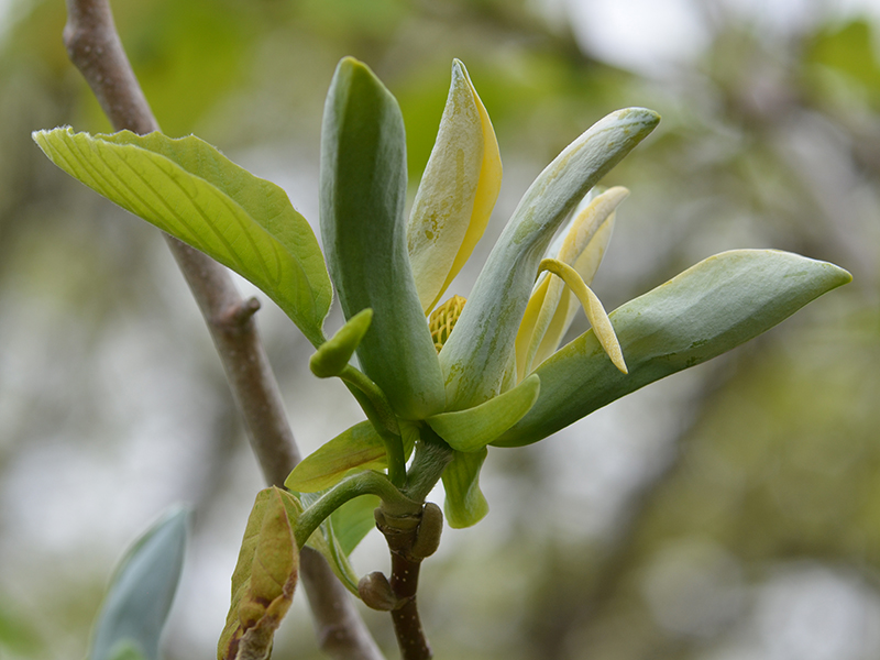 Цветёт в июне, сине-зелеными, нежно ароматными цветками в бутонах, после распускания внутренняя сторона лепестков желтая, синие крупные соцветия выглядит не обычно на фоне высокого дерева. Листва крупная от 10-15см, овальная, летом насыщенно зеленая, слегка кожистая, осенью золотисто желтая. Плоды несъедобные, ярко красные, что придает дереву еще большую декоративность, не только в начале лета, но и осенью, сентябрь-октябрь.