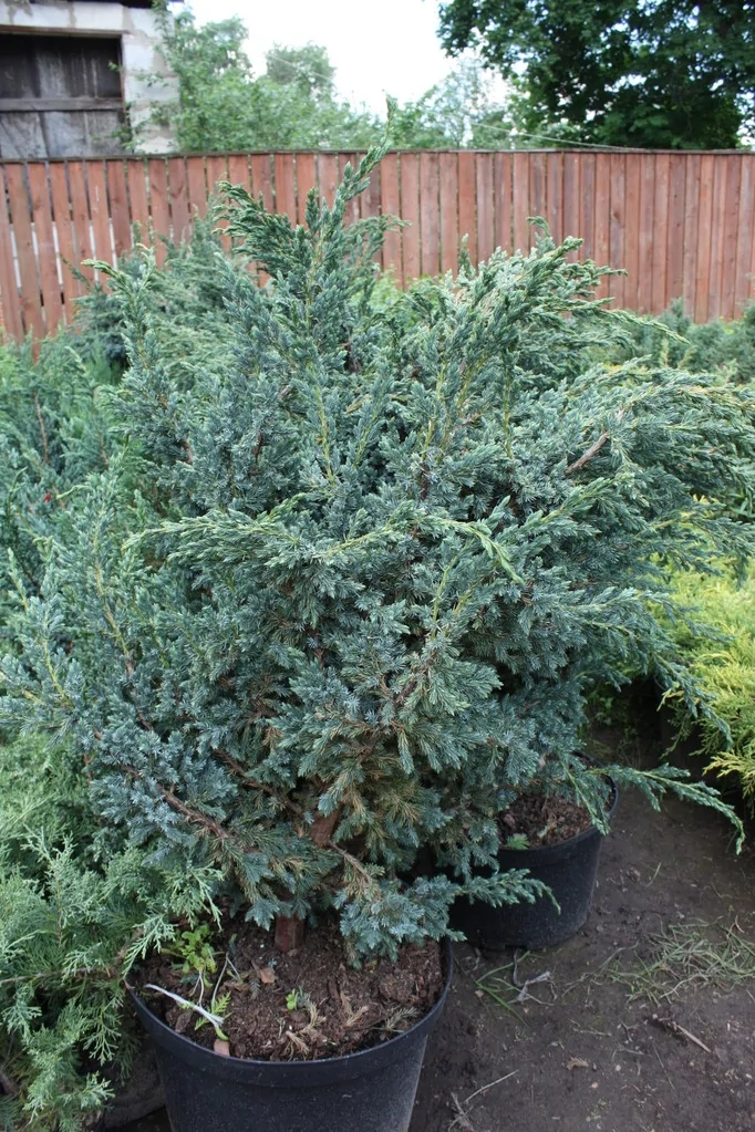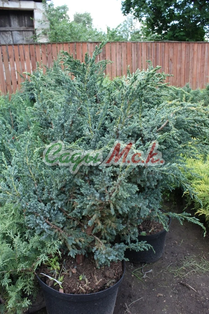 Взрослый куст вырастает до 4 м в высоту, формируя крону шириной около 1,5 м. Ветви косо поднимаются вверх, их концы немного свисают, напоминая фонтан. Побеги покрыты серебристо-голубой хвоей игольчатой формы. Крупномер чешуйчатый Meyeri отличается высокой морозостойкостью, но не терпит снежных сугробов на своих ветвях. К почве куст неприхотлив, лучше развивается в легкой полутени, на открытом солнце может получить ожоги. Используется как в одиночных, так и в групповых посадках.
